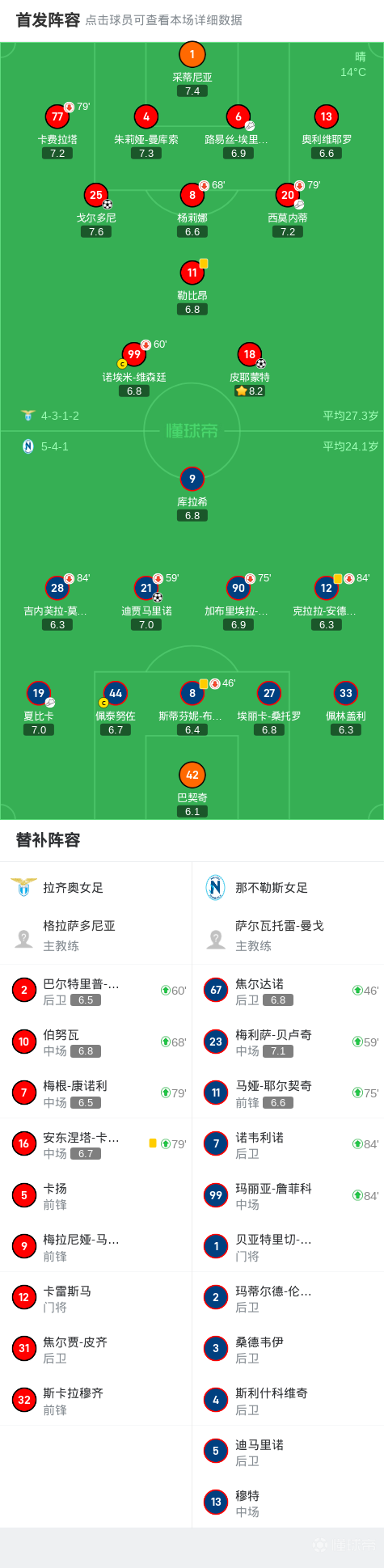 在全场比赛中,皮耶蒙特和戈尔多尼的进球展现了拉齐奥女足的攻击力和团队合作精神,而迪贾马里诺的进球也表现了那不勒斯女足的不屈精神。双方球员在场上展现出顽强的拼搏精神,为观众带来了一场精彩的比赛。虽然比赛已经结束,但双方球员的拼搏精神和对抗精神将会激励着他们在接下来的比赛中继续努力,为观众带来更多精彩的比赛。